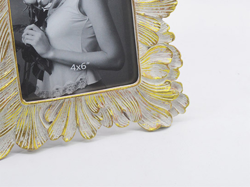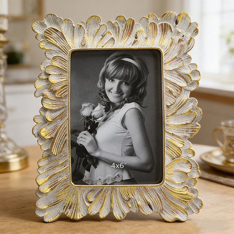Dieser Bilderrahmen ist ein handgefertigtes Kunstharzprodukt im europäischen Vintage-Stil.Es besticht durch einen Rahmen aus übereinanderliegenden Blütenblättern. Durch die Kombination aus gealtertem weißen Hintergrund und Goldmalerei entsteht ein leichter und luxuriöser Retro-Look. Es eignet sich für Fotos im Format 10 x 15 cm und kann als Dekoration auf Schreibtischen oder Schminktischen platziert werden. Auch als exquisites Geschenk für Hochzeiten, Umzüge oder Jubiläen ist es bestens geeignet und verleiht jedem Anlass eine romantische Note.