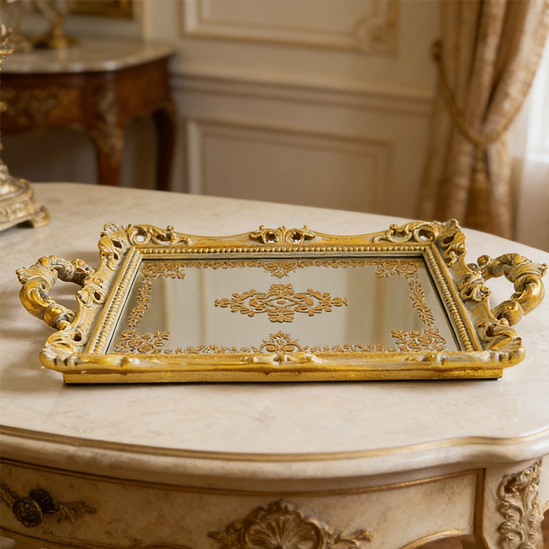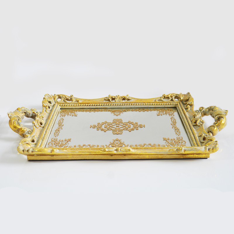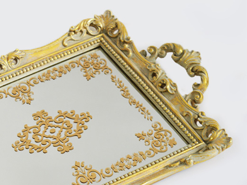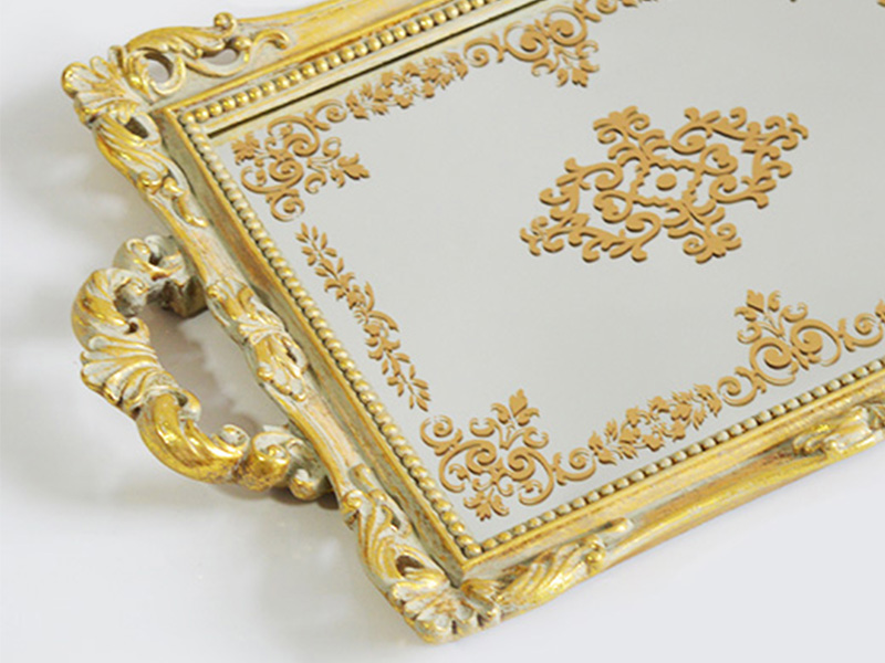 Das Hauptgerüst besteht aus Epoxidharz:Das Tablett besteht aus hartem und leichtem Polyesterharz. Die Oberfläche ist mit Goldfolie verziert und antikisiert, wodurch ein Hauch von Vintage-Gold entsteht. Der Kern des Tabletts ist 3 mm dickes Spiegelglas mit polierten und abgerundeten Kanten. Es ist kratzfest und somit sicher.