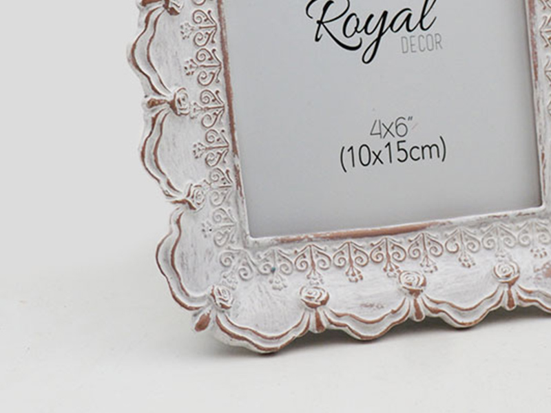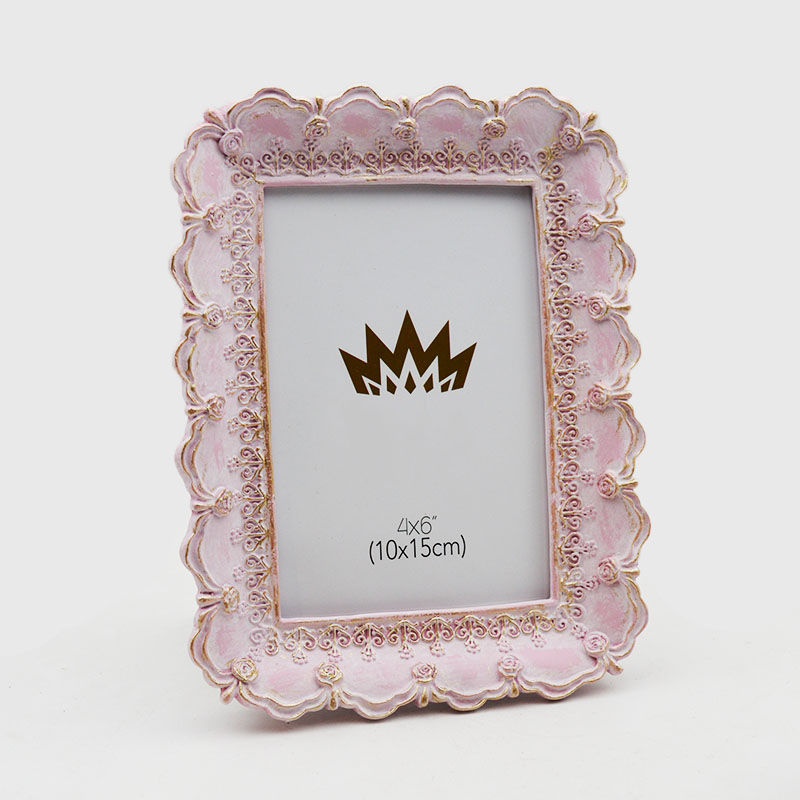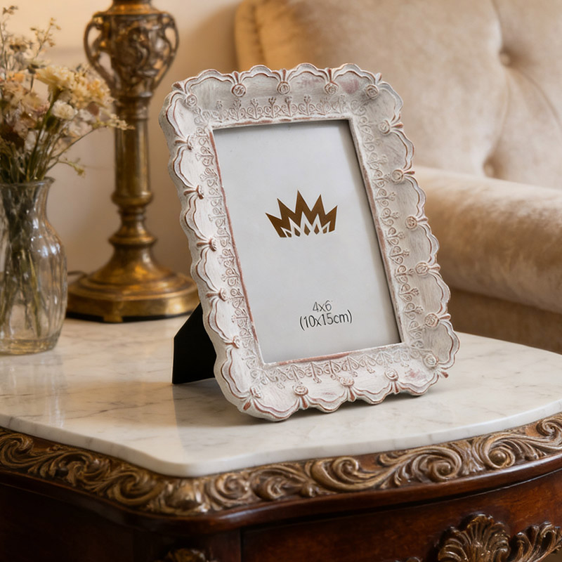 Vintage-Fotorahmen aus geschnitztem, gealtertem, weißem Kunstharz, 4×6 Zoll Es besteht aus umweltfreundlichem Harz und ist handgeschnitzt und im Used-Look gestaltet. Der rosa-weiße Farbverlaufsrahmen ist mit exquisiten Ranken- und Kronenmustern verziert.