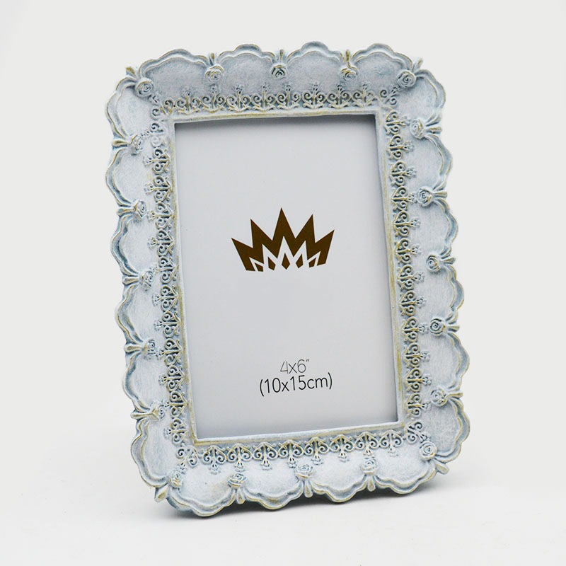 Wir bieten hochwertige Polyresin-Fotorahmen Mit seinem Design im Vintage-Barockstil ist dieses Modell 1758 mit einer handbemalten, antiken blau-goldenen Oberfläche versehen und eignet sich ideal für Einrichtungshäuser, Geschenkartikelläden und Anbieter von Hochzeitsartikeln. Die robuste Harzkonstruktion mit einer Echtglasfront sorgt für eine hohe Wertwahrnehmung bei Ihren Kunden.