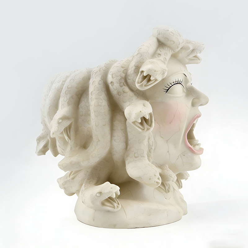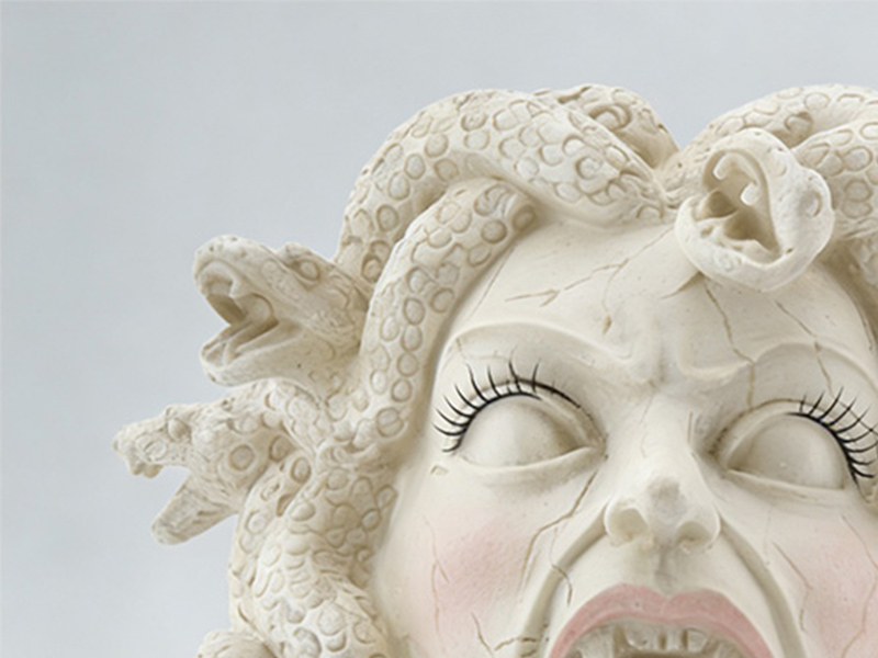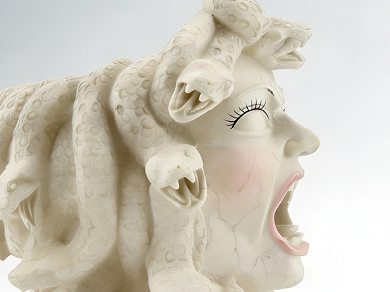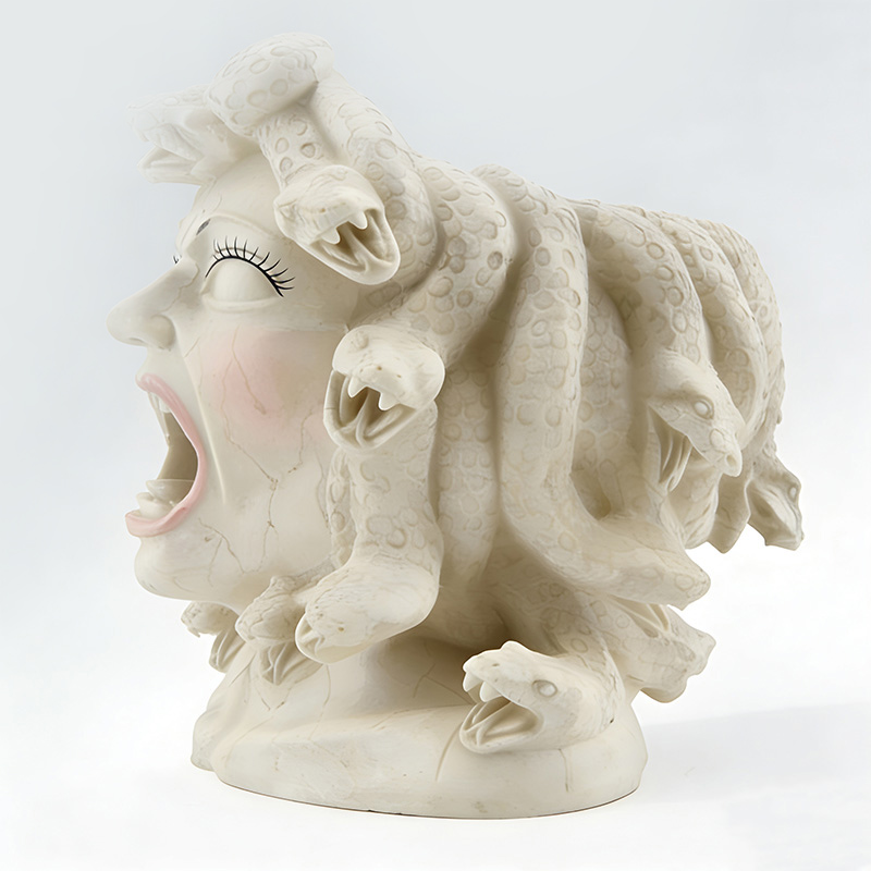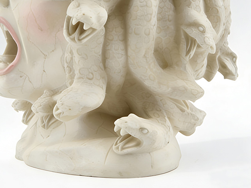 Kopfdesign: Das Haar wurde durch eine gedrehte und gewundene, schlangenartige Textur ersetzt. Die Schuppen und die geschwungenen Formen des Schlangenkörpers sind detailreich dargestellt und geben die klassischen Merkmale der Medusa wieder.