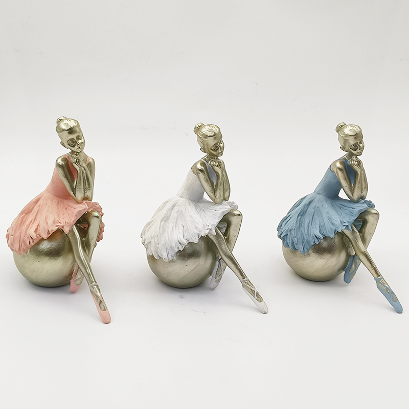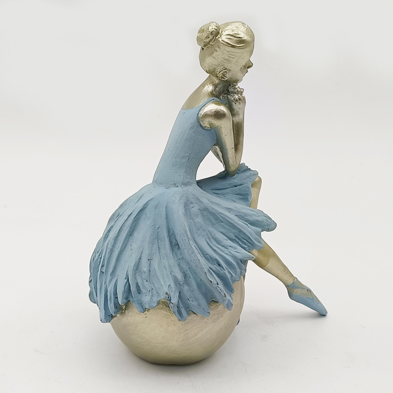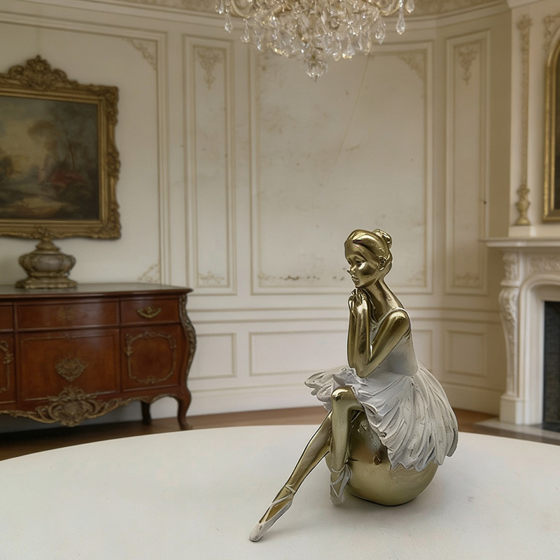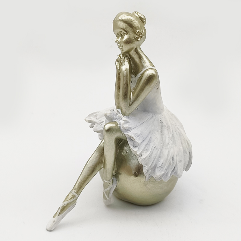 Hauptdesign: Es zeigt eine Balletttänzerin, die auf einer Kugel sitzt, eine Hand am Kinn, die Beine übereinandergeschlagen. Die Haltung ist elegant und stellt die klassische Körpersprache einer Balletttänzerin wieder her, indem sie statische Schönheit mit dynamischer künstlerischer Spannung verbindet.