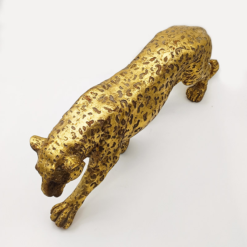 Diese vergoldete Gepardenfigur ist mit viel Liebe zum Detail und realistischen Techniken gefertigt und fängt die dynamische Haltung des Geparden auf allen Vieren perfekt ein. Die Oberfläche ist mit einer gesprenkelten, vergoldeten Textur überzogen, wobei die matte Goldoberfläche mit einer frostigen Metallstruktur kombiniert wird und so den Retro-Charme einer Kupfervergoldung nachempfindet. Die Figur gibt den stromlinienförmigen Körper und die gestreckten Gliedmaßen des Geparden präzise wieder, mit einem leicht geneigten Kopf und einer anmutigen Haltung. Detaillierte Gesichtszüge, Krallen und die deutlich erkennbare Struktur des Gepardenfells runden das Bild ab. Die ungleichmäßige Fellzeichnung ist klar definiert, und die realistische Darstellung der Muskellinien verleiht der Figur eine kraftvolle Ausstrahlung.