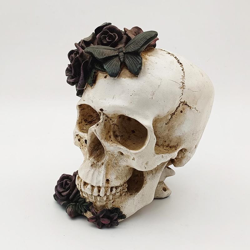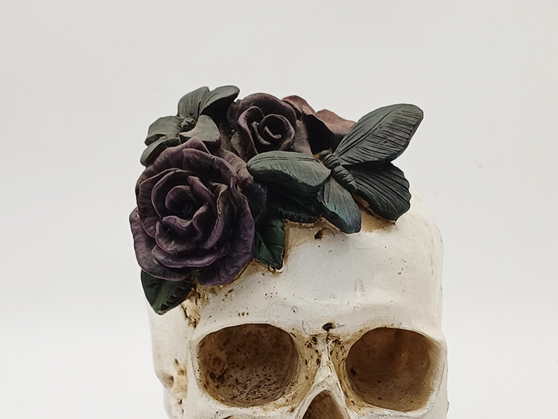 Grundfarben: Der Hauptteil des Skeletts ist mit zwei bis drei dünnen Schichten matter weißer Farbe überzogen. Nach dem Trocknen wird er gealtert und mit dunklen Pigmenten gefärbt, um die Knochenstruktur hervorzuheben. Die Rosen sind in Schichten koloriert (dunkelviolette Grundfarbe + dunkelrosa Farbverlauf), die Blätter sind dunkelgrün gemalt, und der Schmetterling ist in Schwarz-Weiß oder kontrastierendem Dunkelviolett gehalten, jeweils mit feinen Linien, um die detaillierten Muster zu betonen.