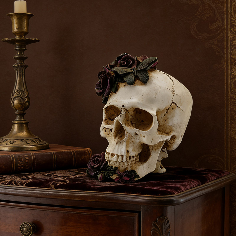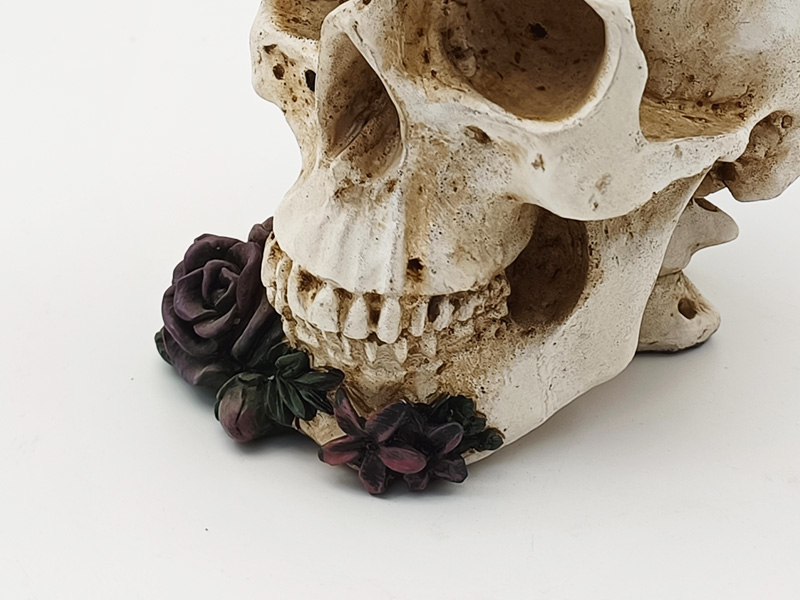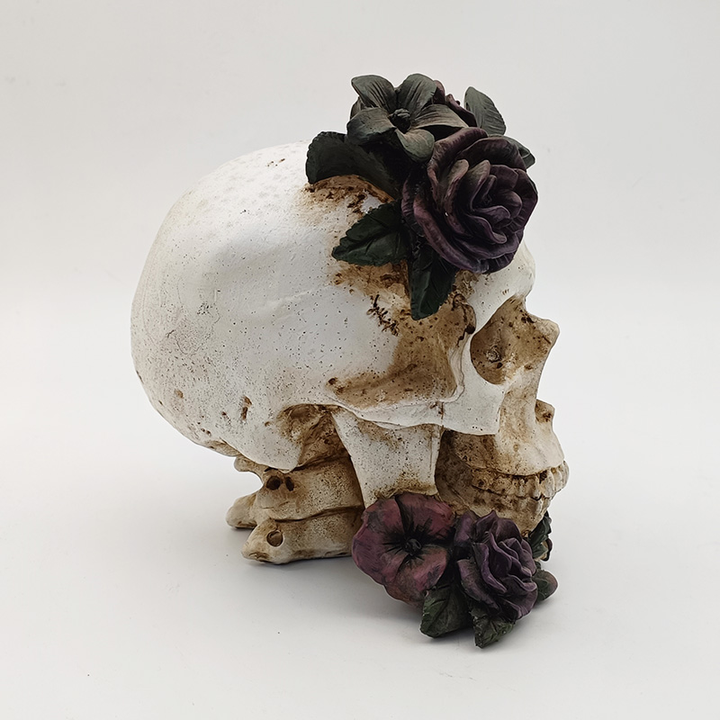 Blumen und Dekorationen: Auf dem Schädel und am Unterkiefer befinden sich dreidimensionale, tiefviolette Rosen. Die Blütenblätter sind deutlich geschichtet und weisen eine feine Textur auf, die von Tiefviolett zu Dunkelrosa verläuft. Die Textur wirkt sehr realistisch. Neben den Rosen …