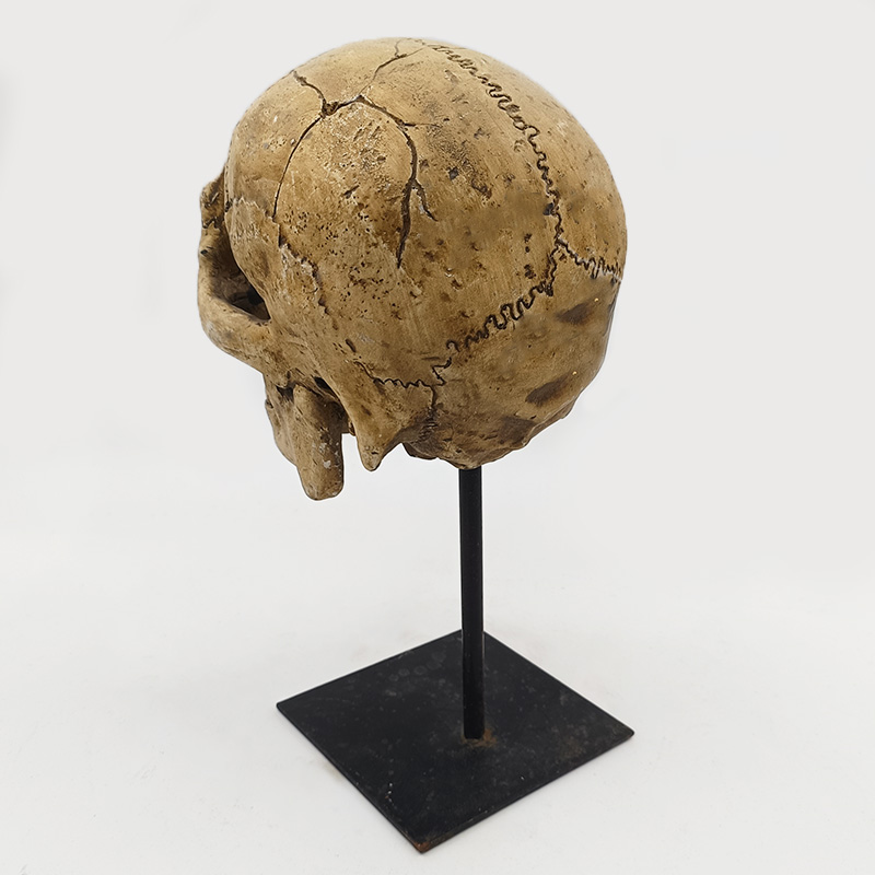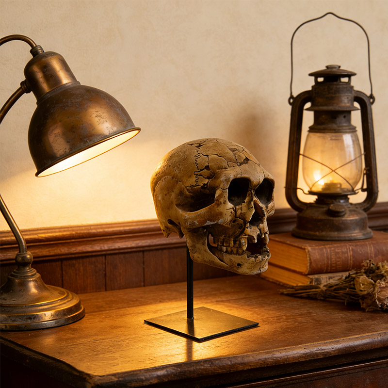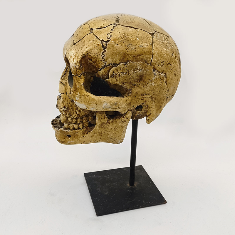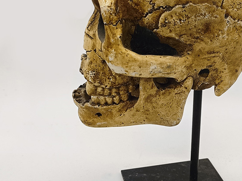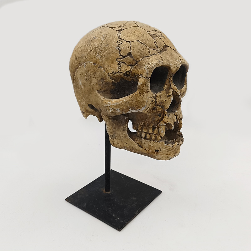 Material und Verarbeitung: Das aus Kunstharz gefertigte Modell ist hart und langlebig und gibt die feine Knochenstruktur präzise wieder. Dank seines moderaten Gewichts lässt es sich leicht transportieren und präsentieren. Es besteht aus einem schwarzen Metallständer mit quadratischem Sockel. Der Ständer stützt den Schädel vertikal, der Sockel sorgt für Stabilität und verhindert Wackeln. Die Kombination aus schwarzem Metall und knochenähnlicher Textur ermöglicht nicht nur eine einfache Platzierung und Präsentation, sondern erzeugt auch einen reizvollen Kontrast, der die künstlerische Wirkung unterstreicht.