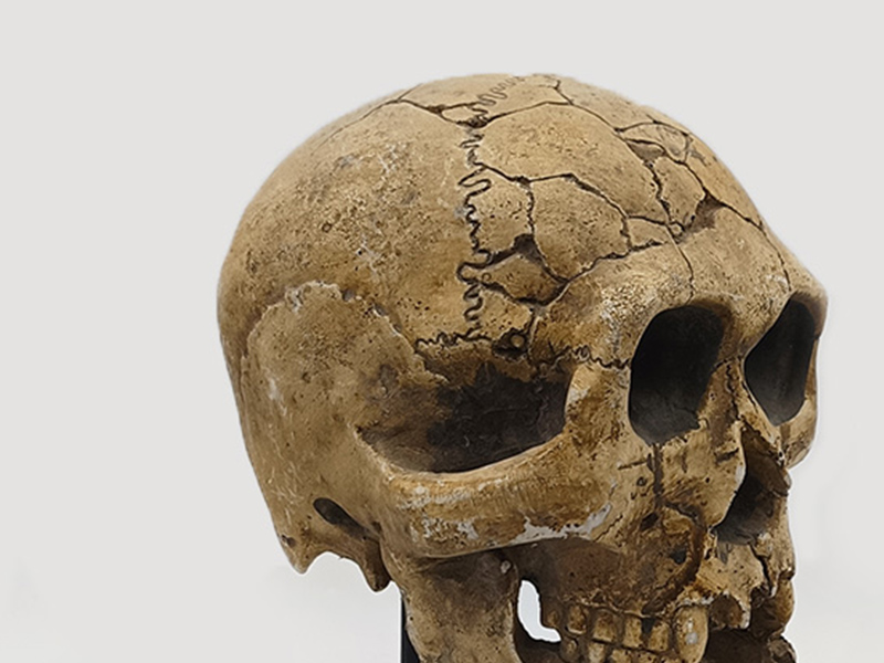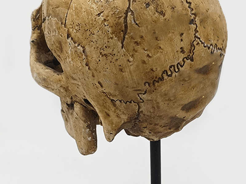 Textur und Haptik: Die Oberfläche wurde künstlich gealtert, um natürliche Rissstrukturen und gelbliche, fossilienähnliche Texturen zu erzeugen, die die Alterung des Schädels im Laufe der Zeit simulieren. Die Texturtiefen verzahnen sich und erzeugen so einen starken Eindruck von Dreidimensionalität.