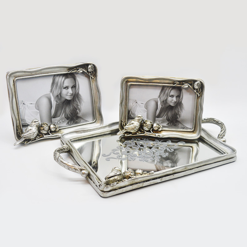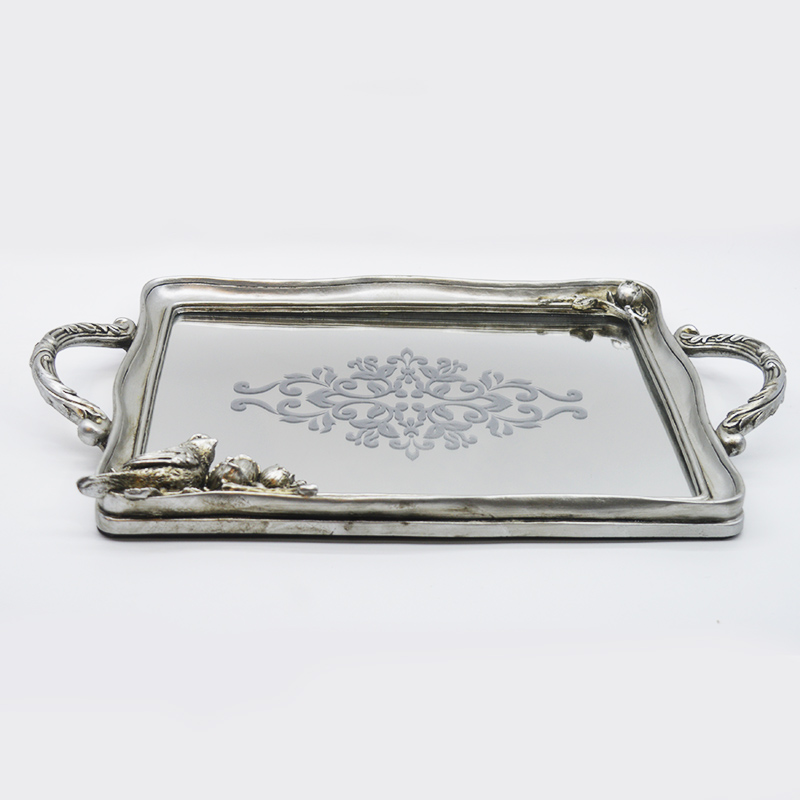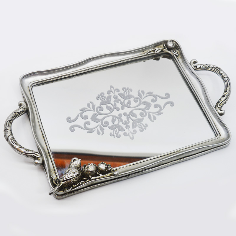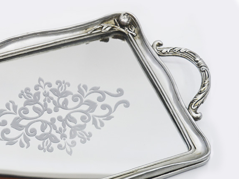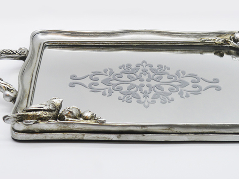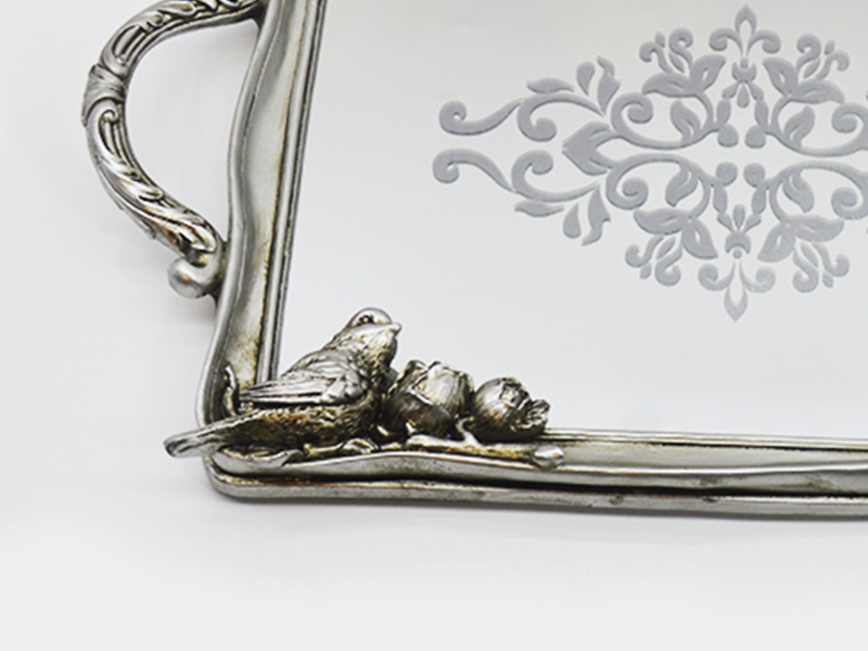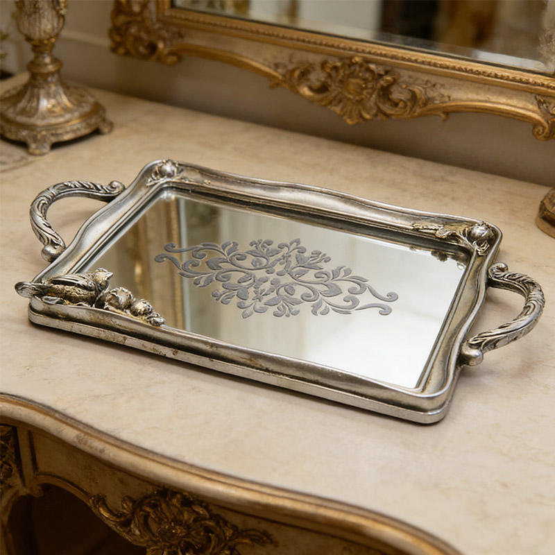 Der Hauptrahmen besteht aus Harzmaterial mit einer retro-gealterten Silberplattierung an der Oberfläche, die eine matte metallische Textur aufweist; der innere Kern des Tabletts besteht aus 3 mm dickem hochauflösendem Spiegelglas, das dekorative und praktische Eigenschaften vereint.